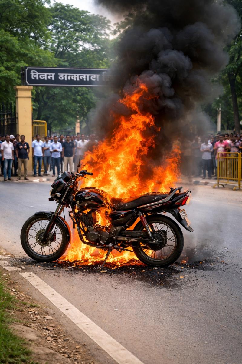 कोर्ट परिसर के नजदीक बाइक में लगी आग, चालक ने कूदकर बचाई जान